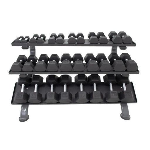 TKO Strength 3-Tier Horizontal Dumbbell Rack 890HDR-B TKO 3-Tier full commercial rack allows for up to 15 pairs of dumbbells to be stored on a hea...