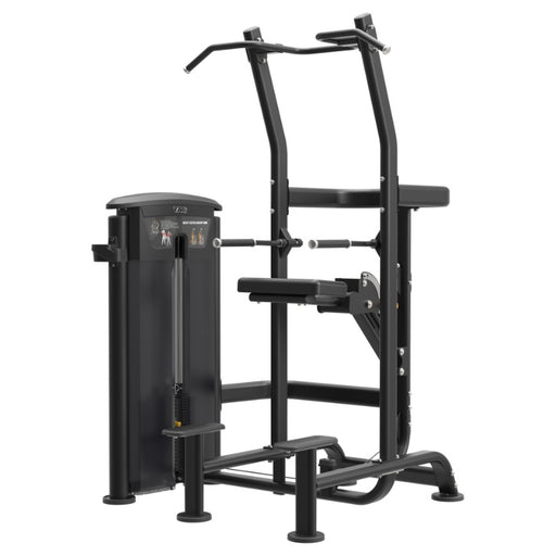 Selectorized, weight-assisted chin-up & dip station with sleek black finish.